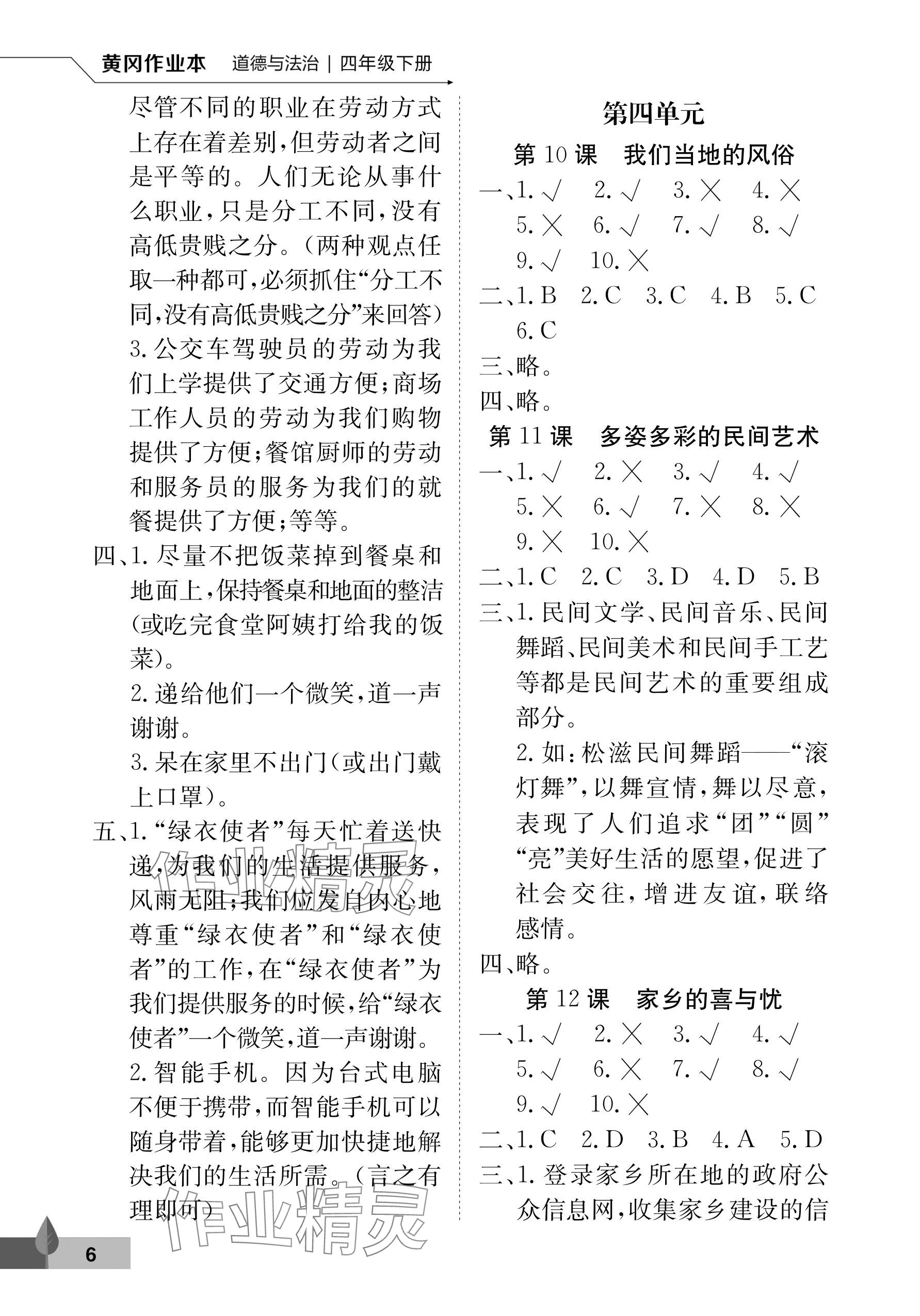 注:目前有些书本章节名称可能整理的还不是很完善,但都是按照顺序排列的,请同学们按照顺序仔细查找。练习册 2025年黄冈作业本武汉大学出版社四年级道德与法治下册人教版 答案主要是用来给同学们做完题方便对答案用的,请勿直接抄袭。