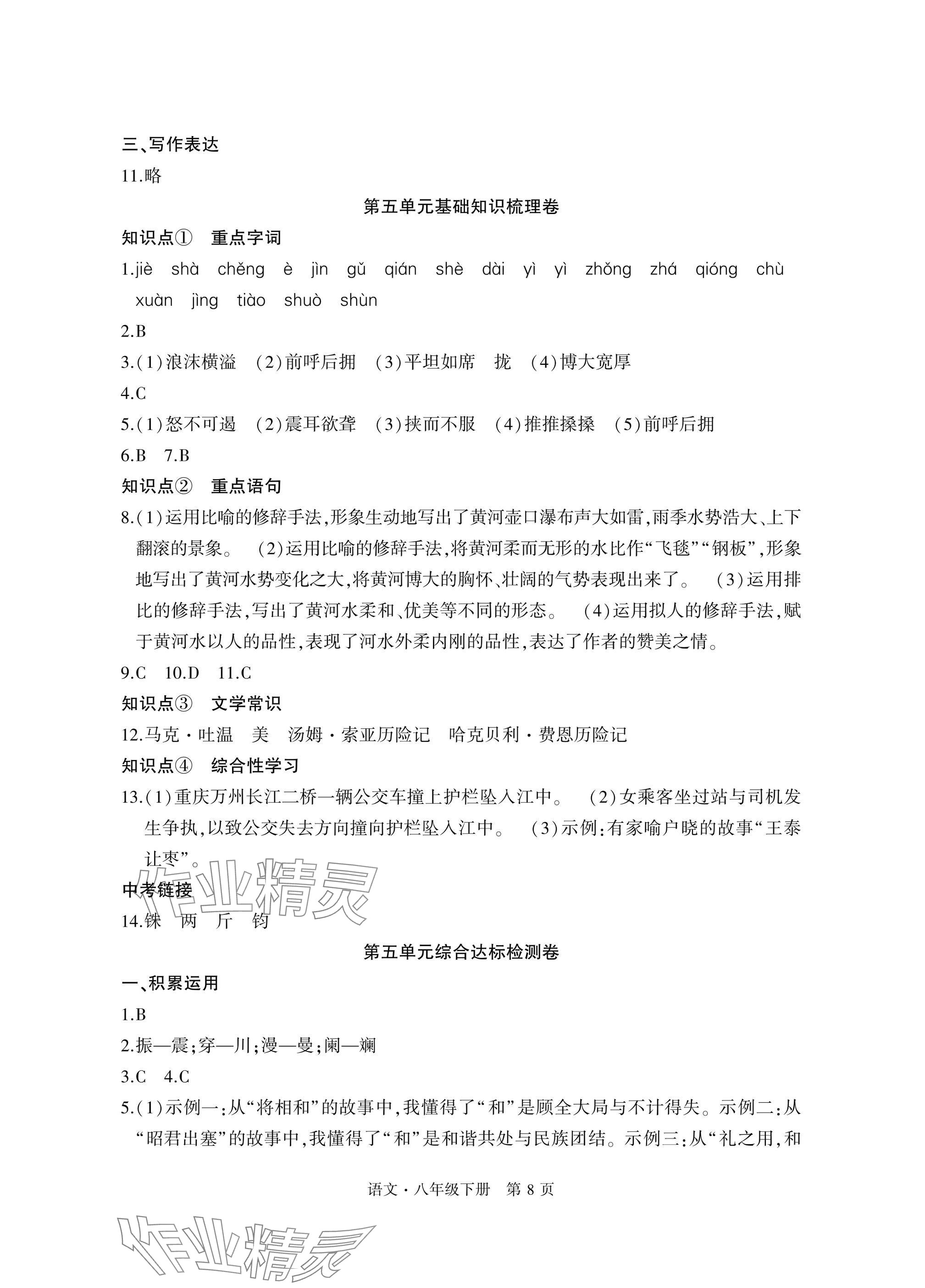 注:目前有些书本章节名称可能整理的还不是很完善,但都是按照顺序排列的,请同学们按照顺序仔细查找。练习册 2025年初中同步练习册自主测试卷八年级语文下册人教版 答案主要是用来给同学们做完题方便对答案用的,请勿直接抄袭。