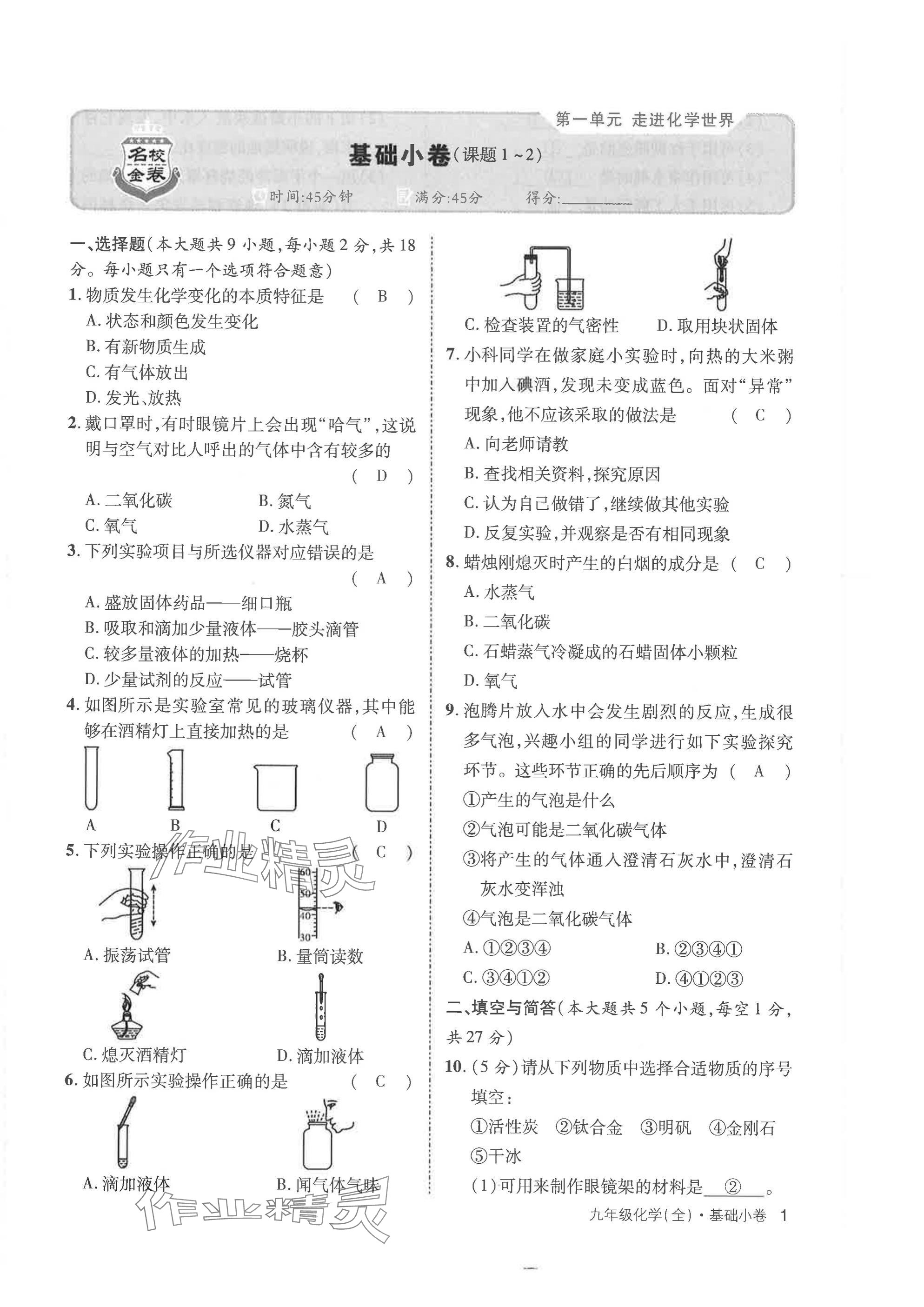 注:目前有些书本章节名称可能整理的还不是很完善,但都是按照顺序排列的,请同学们按照顺序仔细查找。练习册 2024年云南本土名校金卷九年级化学全一册人教版 答案主要是用来给同学们做完题方便对答案用的,请勿直接抄袭。
