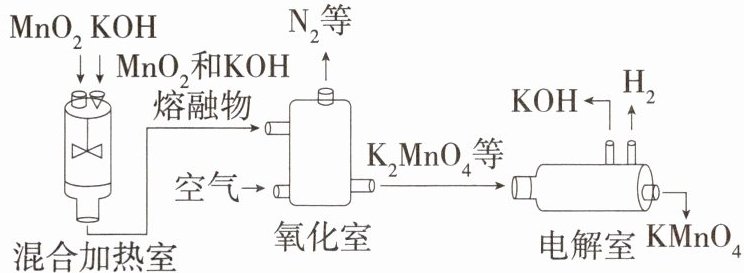A混合加热室中二氧化锰和氢氧化钾变为熔融物,只是状态发生了改变,没有生成新物质,是物理变化;氧化室中反应物为$MnO_{2}$、$KOH$和$O_{2}$等,生成物中有$K_{2}MnO_{4}$,$N_{2}$来自空气,不是生成物;循环使用的物质即是反应物与生成物(不同反应中)中都具有的物质,故氢氧化钾是能循环使用的物质;电解室中有$H_{2}$、$KMnO_{4}$、$KOH$等新物质生成,发生了化学变化。