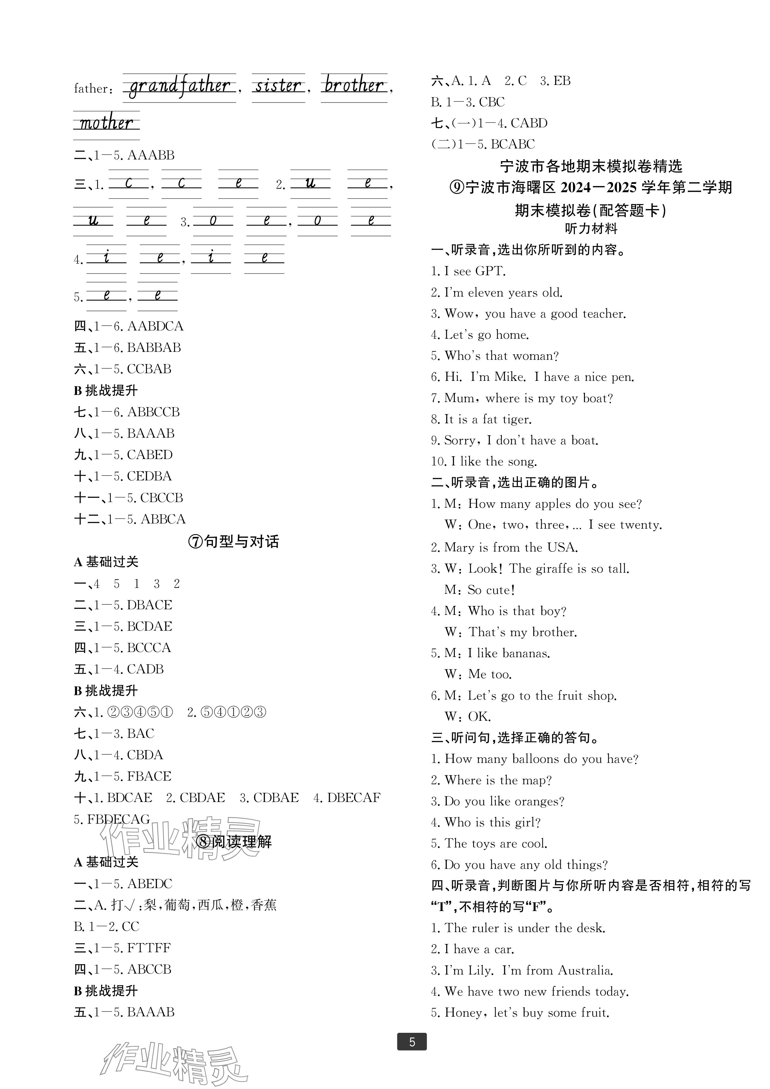 注:目前有些书本章节名称可能整理的还不是很完善,但都是按照顺序排列的,请同学们按照顺序仔细查找。练习册 2025年浙江新期末三年级英语下册人教版宁波专版 答案主要是用来给同学们做完题方便对答案用的,请勿直接抄袭。