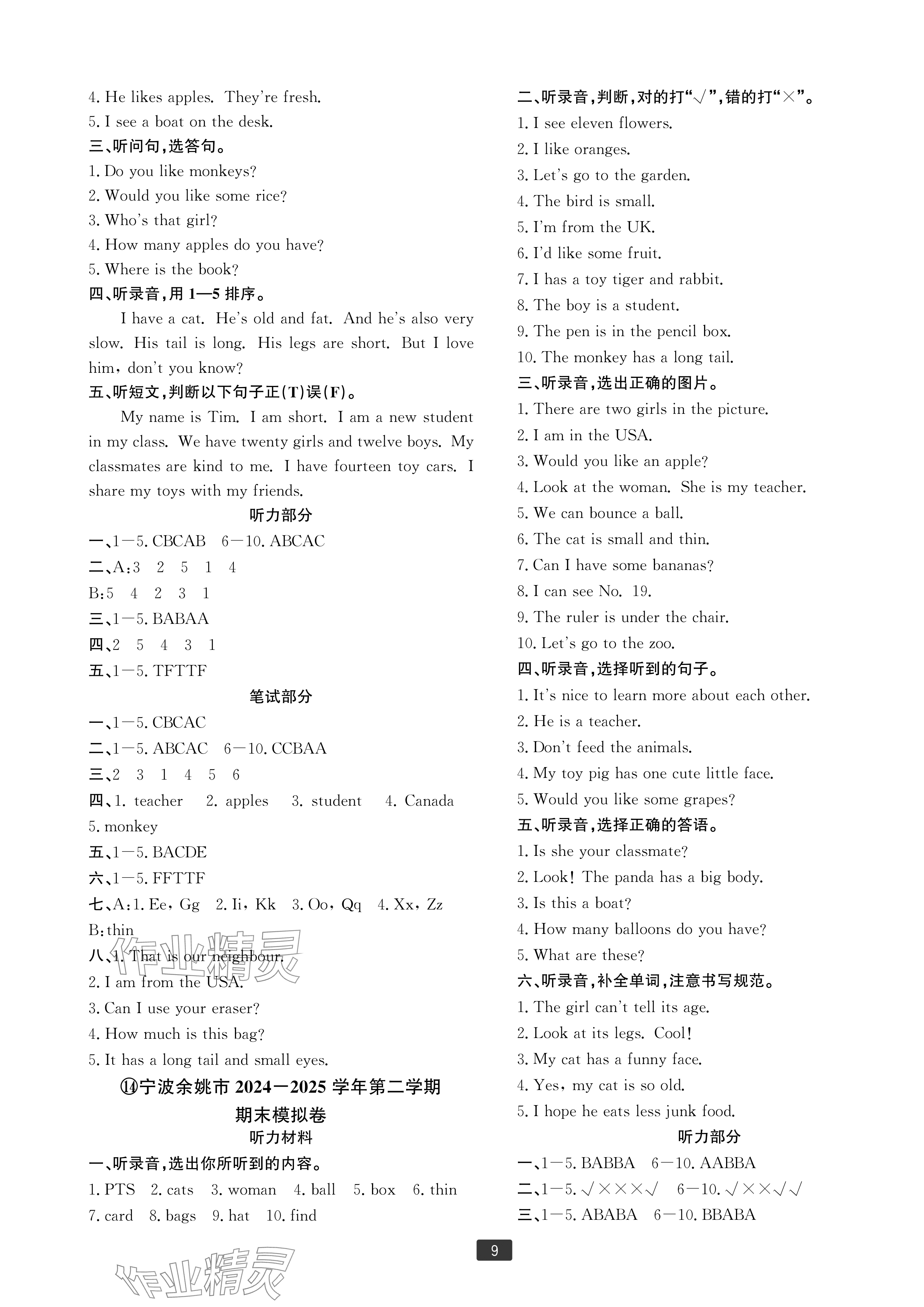 注:目前有些书本章节名称可能整理的还不是很完善,但都是按照顺序排列的,请同学们按照顺序仔细查找。练习册 2025年浙江新期末三年级英语下册人教版宁波专版 答案主要是用来给同学们做完题方便对答案用的,请勿直接抄袭。