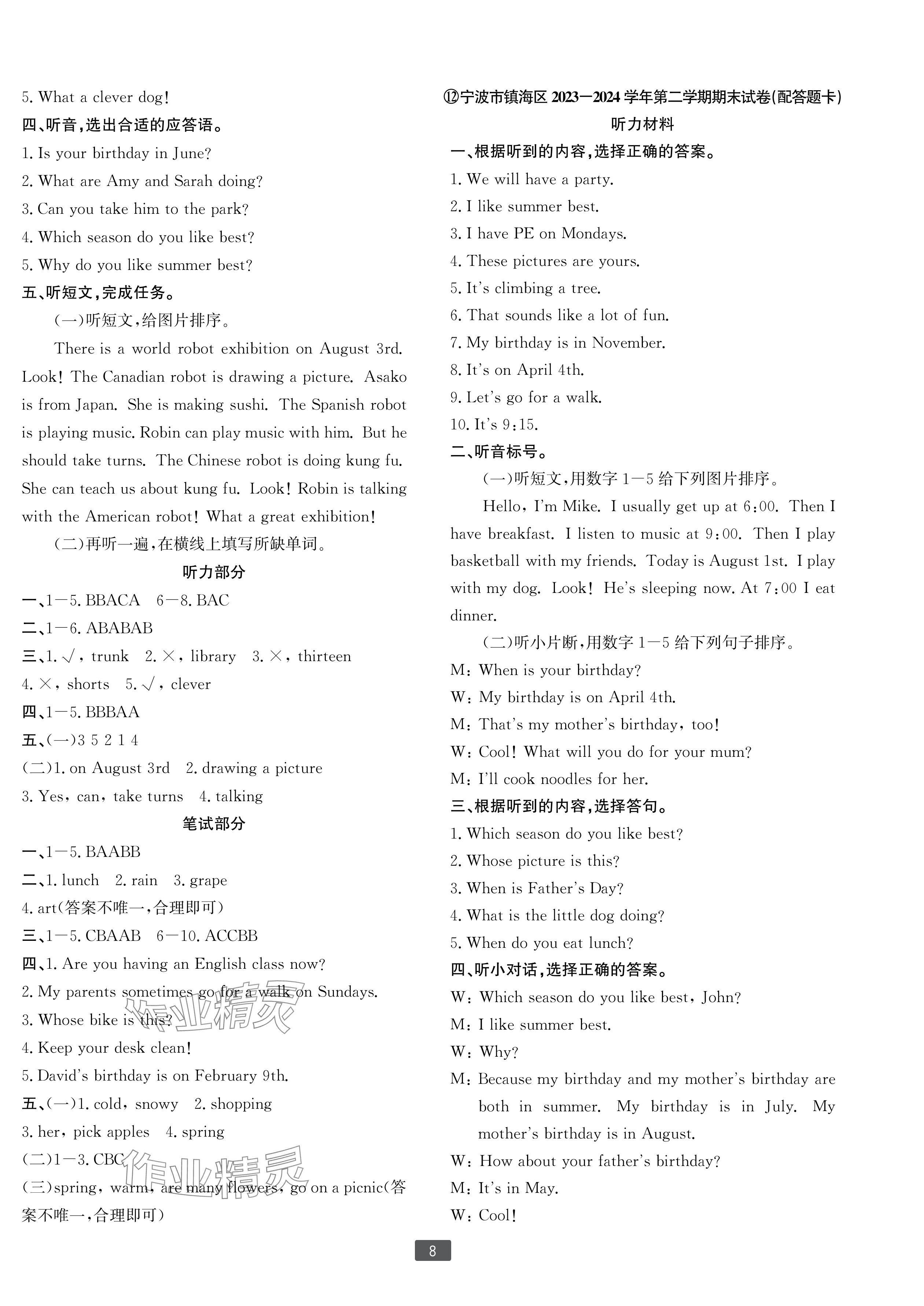 注:目前有些书本章节名称可能整理的还不是很完善,但都是按照顺序排列的,请同学们按照顺序仔细查找。练习册 2025年浙江新期末五年级英语下册人教版宁波专版 答案主要是用来给同学们做完题方便对答案用的,请勿直接抄袭。