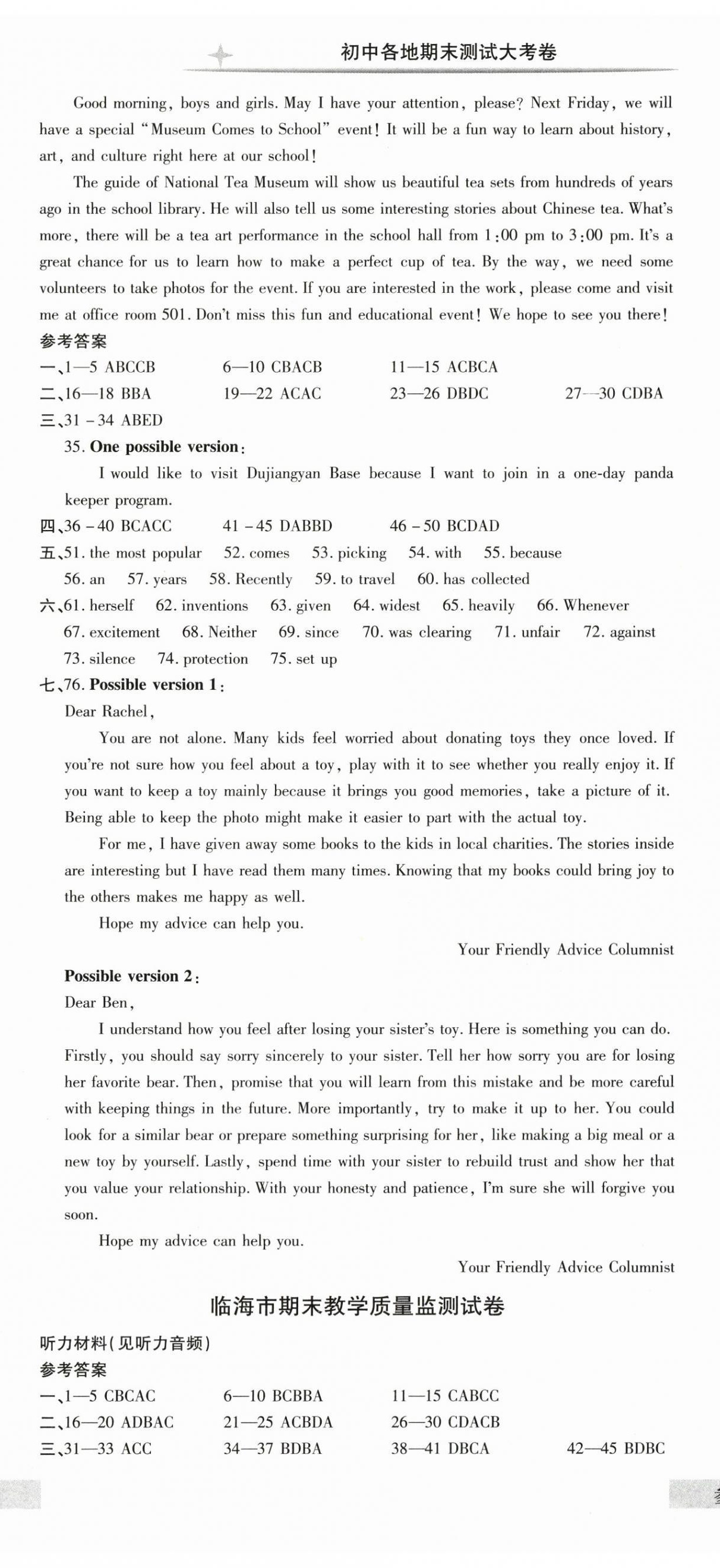 注:目前有些书本章节名称可能整理的还不是很完善,但都是按照顺序排列的,请同学们按照顺序仔细查找。练习册 2025年初中各地期末测试大考卷八年级英语下册人教版浙江专版 答案主要是用来给同学们做完题方便对答案用的,请勿直接抄袭。