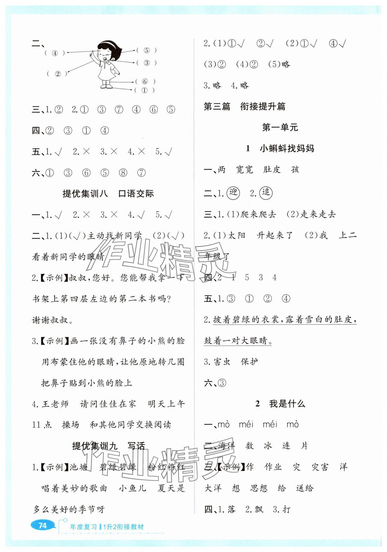 注:目前有些书本章节名称可能整理的还不是很完善,但都是按照顺序排列的,请同学们按照顺序仔细查找。练习册 2025年赢在暑假衔接教材一年级语文人教版 答案主要是用来给同学们做完题方便对答案用的,请勿直接抄袭。