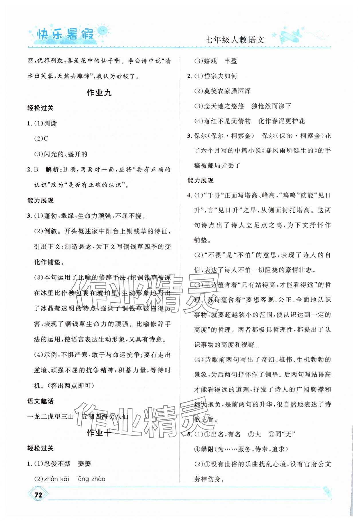 注:目前有些书本章节名称可能整理的还不是很完善,但都是按照顺序排列的,请同学们按照顺序仔细查找。练习册 2025年赢在起跑线中学生快乐暑假七年级语文人教版河北少年儿童出版社 答案主要是用来给同学们做完题方便对答案用的,请勿直接抄袭。