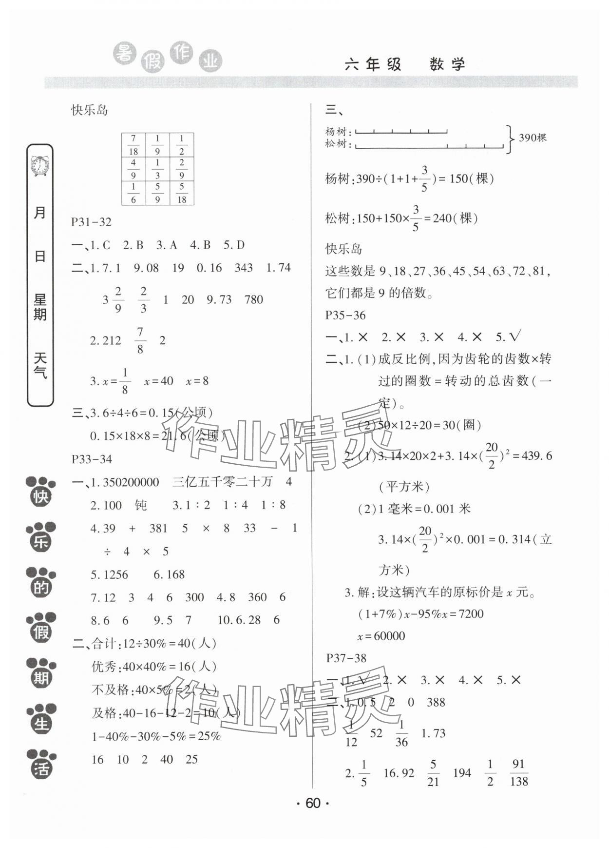 《2025年暑假作业河南人民出版社六年级数学苏教版》