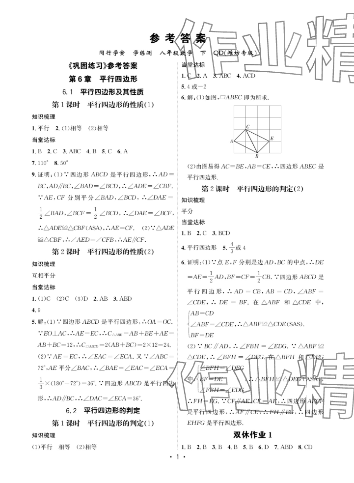注:目前有些书本章节名称可能整理的还不是很完善,但都是按照顺序排列的,请同学们按照顺序仔细查找。练习册 2025年同行学案学练测八年级数学下册青岛版 答案主要是用来给同学们做完题方便对答案用的,请勿直接抄袭。