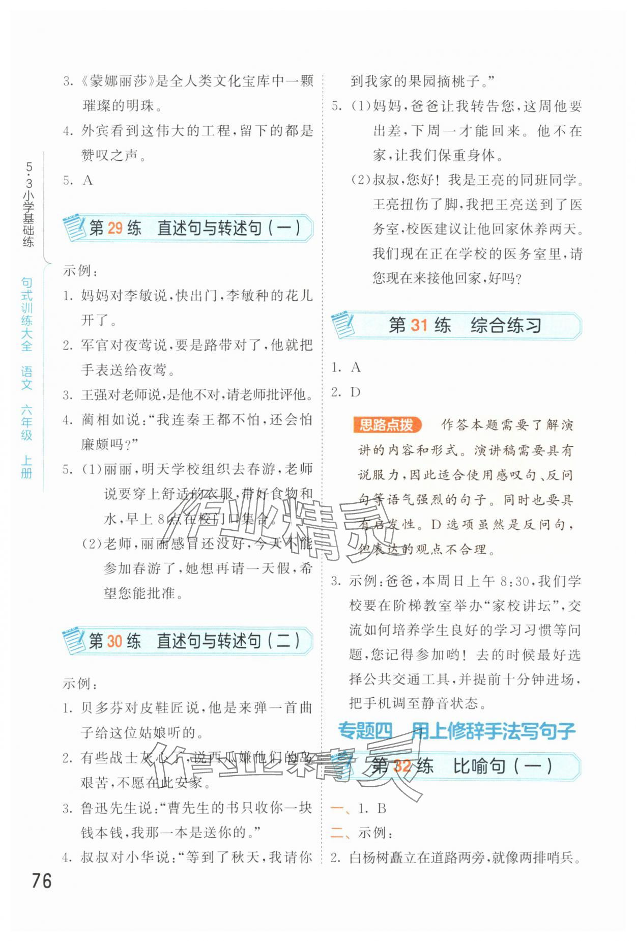 注:目前有些书本章节名称可能整理的还不是很完善,但都是按照顺序排列的,请同学们按照顺序仔细查找。练习册 2025年句式训练大全六年级语文上册人教版 答案主要是用来给同学们做完题方便对答案用的,请勿直接抄袭。