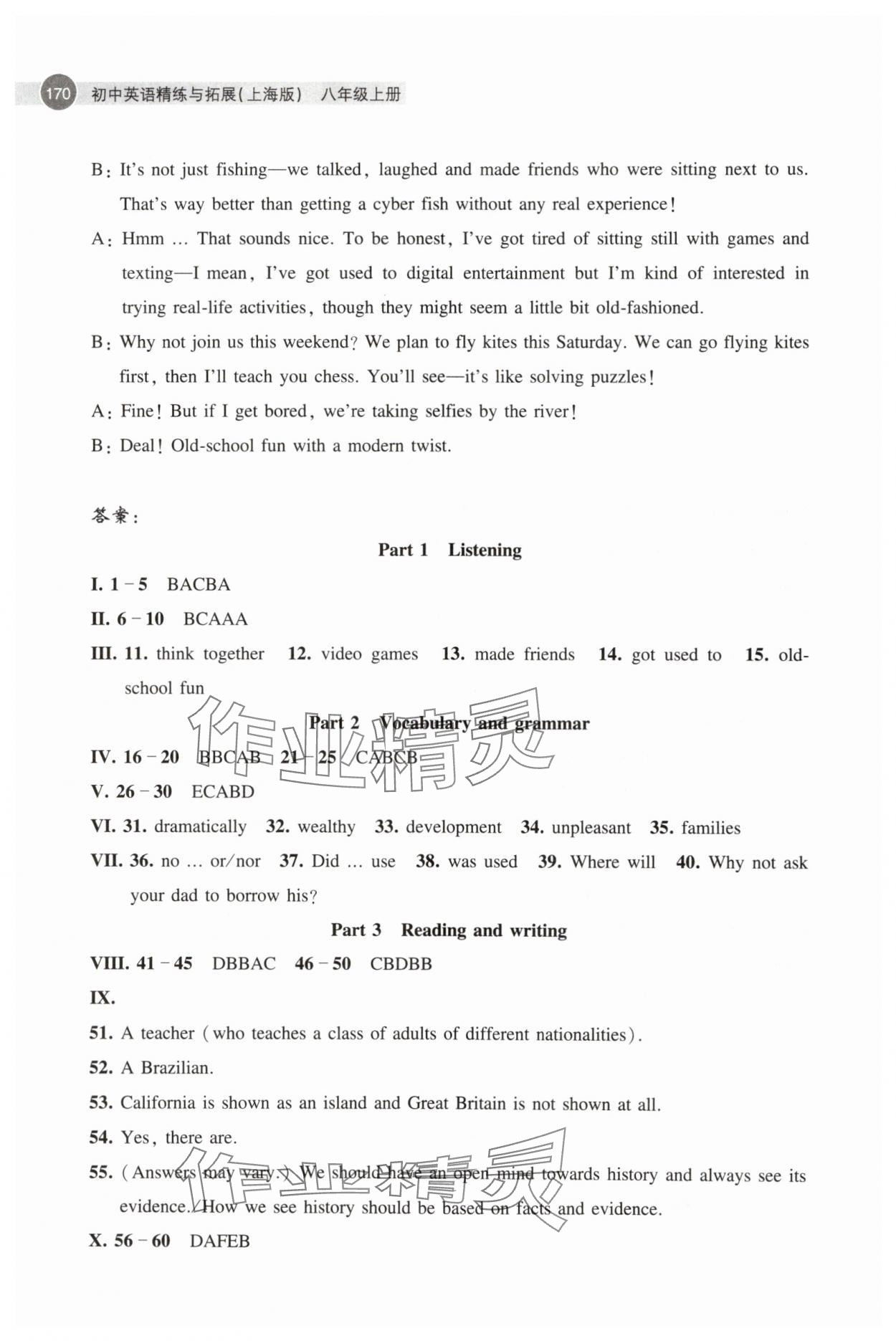 注:目前有些书本章节名称可能整理的还不是很完善,但都是按照顺序排列的,请同学们按照顺序仔细查找。练习册 2025年初中英语精练与拓展八年级英语上册沪教版 答案主要是用来给同学们做完题方便对答案用的,请勿直接抄袭。