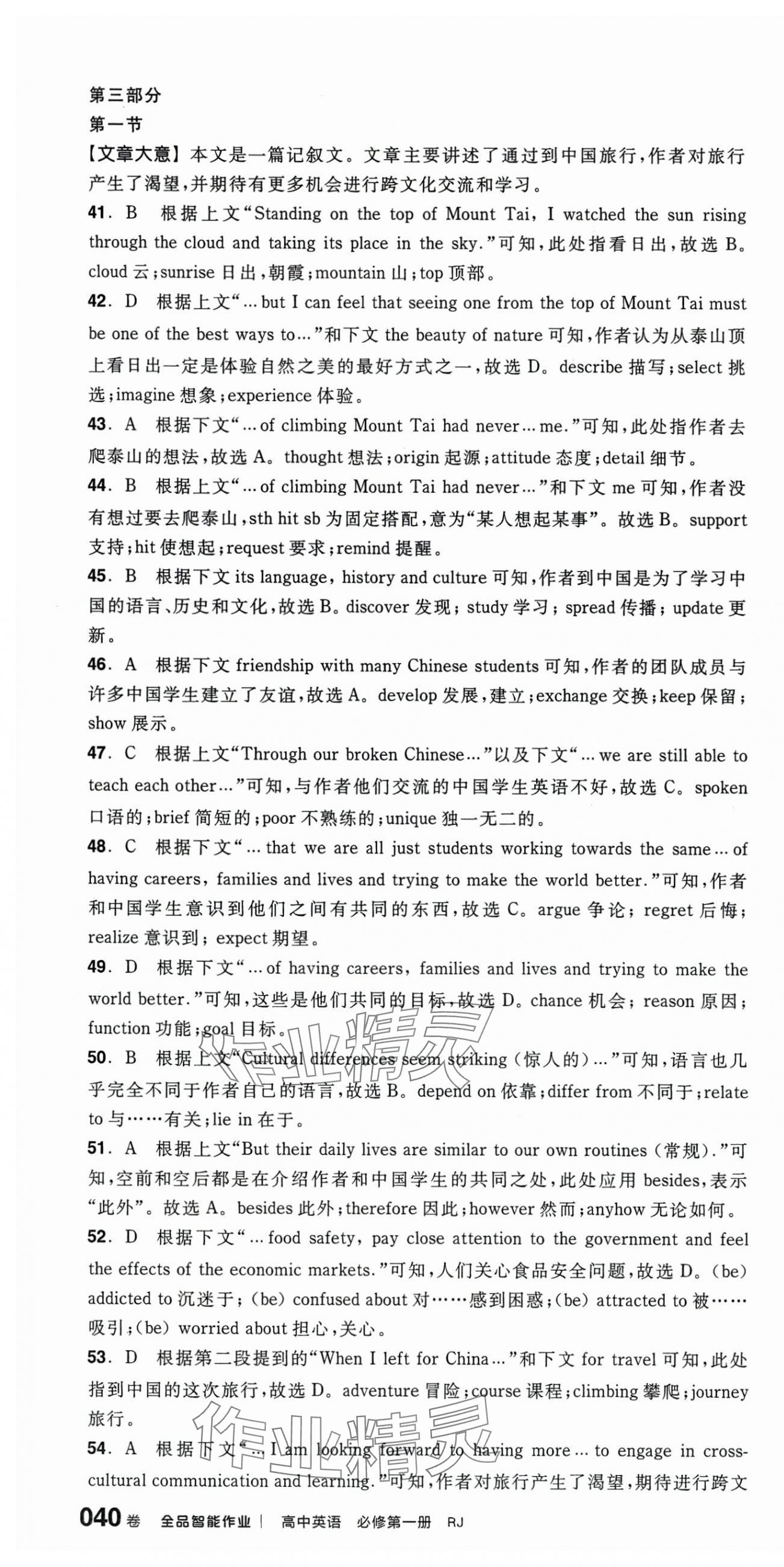 注:目前有些书本章节名称可能整理的还不是很完善,但都是按照顺序排列的,请同学们按照顺序仔细查找。练习册 2025年全品智能作业高中英语必修第一册人教版 答案主要是用来给同学们做完题方便对答案用的,请勿直接抄袭。