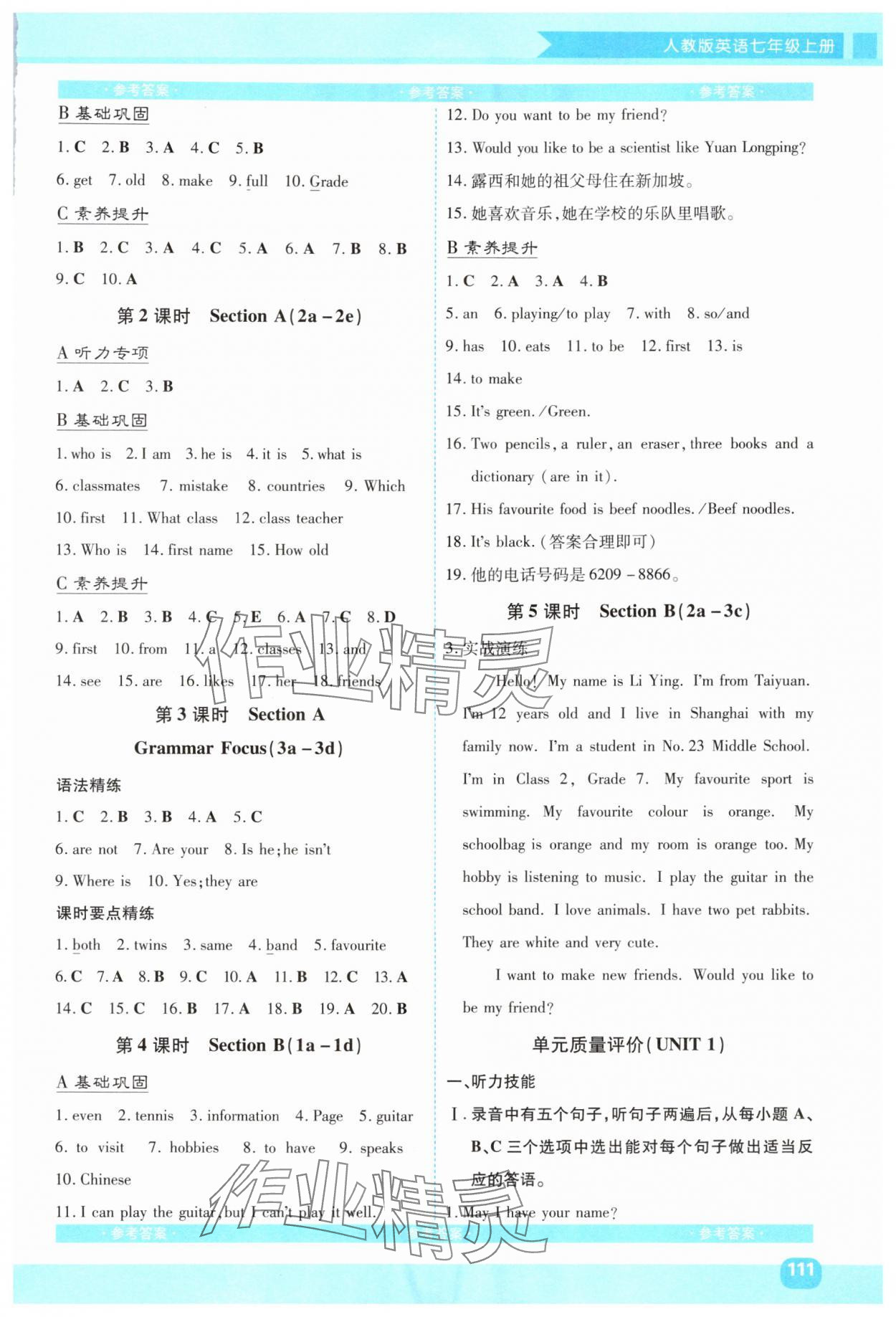精英家教网> 2025年同步实践评价课程基础训练湖南少年儿童出版社七年级英语上册人教版 > 第3页 参考答案