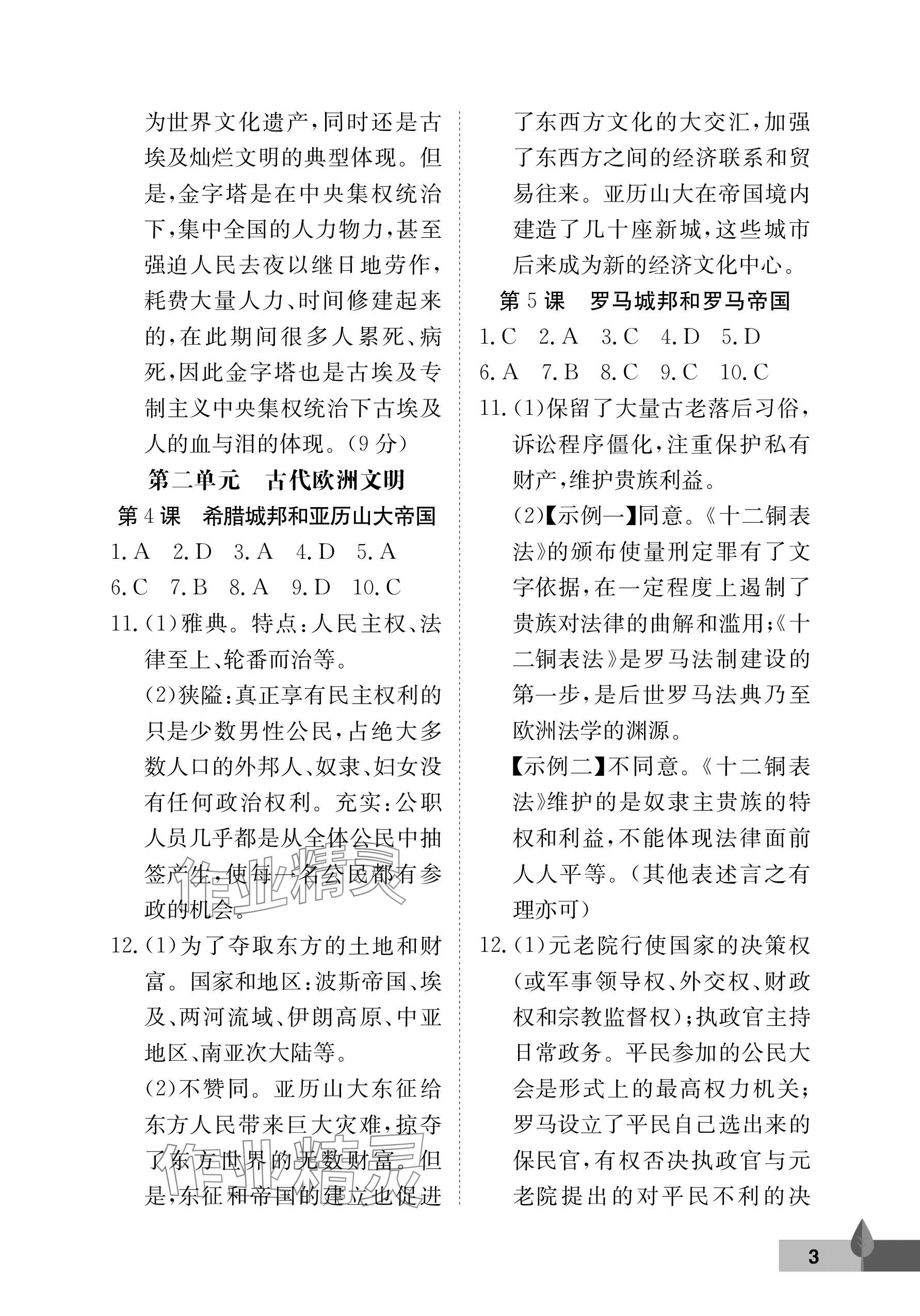 2025年黄冈作业本武汉大学出版社九年级历史上册人教版 参考答案第3页