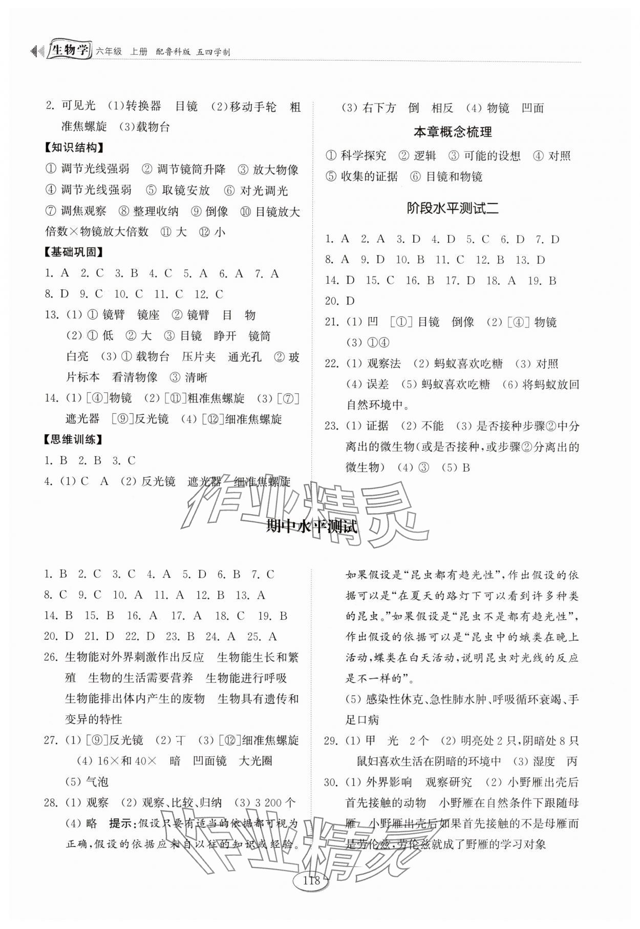 注:目前有些书本章节名称可能整理的还不是很完善,但都是按照顺序排列的,请同学们按照顺序仔细查找。练习册 2025年同步练习册山东科学技术出版社六年级生物上册鲁科版54制 答案主要是用来给同学们做完题方便对答案用的,请勿直接抄袭。