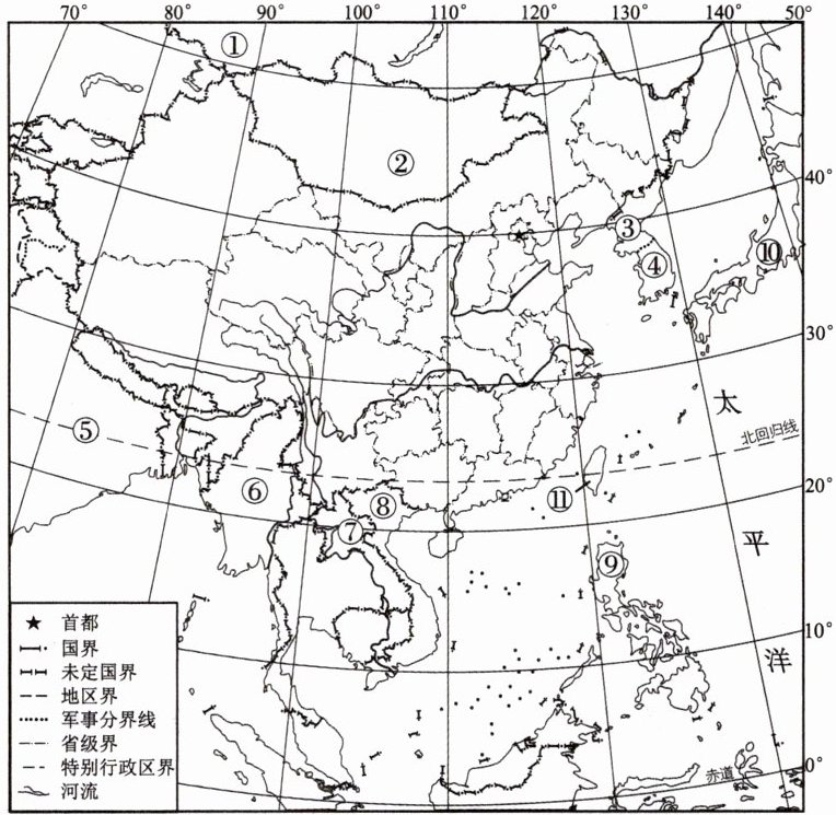 (4)乌苏里 2.960万 3.俄罗斯 蒙古 朝鲜 印度 缅甸 老挝 越南 ②⑦ 5.台湾岛 6.韩国 菲律宾 日本
