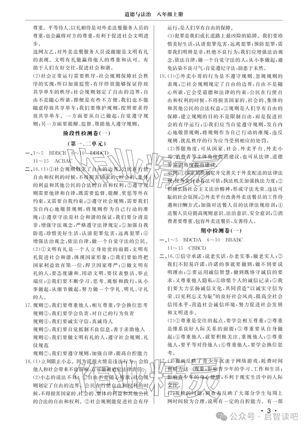 2025年同步练习册分层检测卷八年级道德与法治上册人教版 参考答案第3页