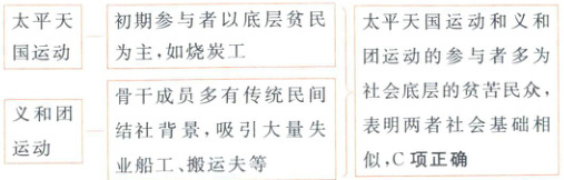 6. 太平天国运动初期,参与者以底层贫民为主,如烧炭工;义和团运动的骨干成员,多有传统民间结社(如拳会、刀会)背景,义和团运动还吸引了大量失业的船工、搬运夫等。这表明两者