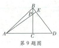 9. 右侧扫码·视频讲解 如图,在$ Rt\triangle ABC$中,$AC = BC = 4$,延长$AC$至点$D$,使$CD = 3$,连接$BD$,作$AE\perp BD$,垂足为$E$,$AE$交$BC$于点$P$,则$PE$的长度为(