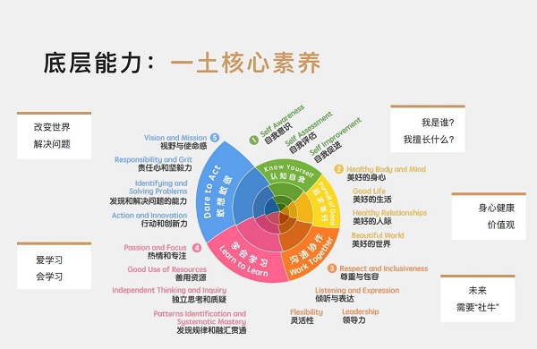 基于这样的教育宗旨,一土一直注重培养学生的核心素养,包括对自我的认知,对美好生活和美好世界的追求,善于与人沟通协作解决问题的能力,应对变化的世界终身学习的能力、强大的使命感和行动力。在5个维度之下,一土的核心素养体系细分为19个素养,对应到每个年龄的不同表现,深入到日常的教学和活动中,让每一个素养都有意识地被培养。