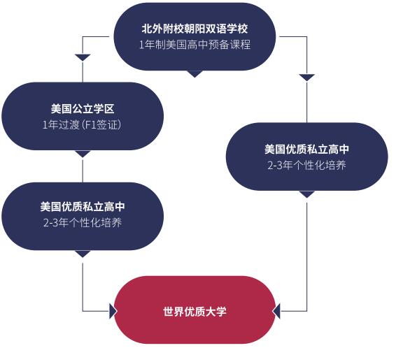 北京外国语大学附校朝阳双语学校联合美国优质公立学区(教育局),研发开设1年制美国高中预备课程,整合中美优质教育资源,基于北京外国语大学校园、美国优质公立高中以及专业完备的留学支持体系,帮助即将进入美国读高中的中国学生完成中美教育衔接和生活、文化心理适应,同时横跨中美的四大教育团队,在学生进入美国以后依然提供持续、专业、本地化的海外教育支持,保学生的学业成功和成长成才。