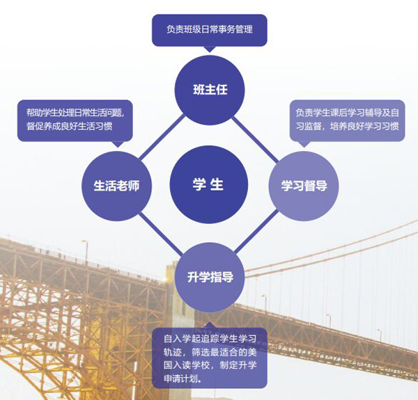 在学区和学校已有的教育团队基础上,北外还配备了学术指导、学生管理、住家管理、家庭教育四个团队,结合SPI系统和行业领先的IT运营管理系统实时协作,对学生提供实时的教育和支撑,对住家进行有序管理和支持,以月为单位向家长提供报告,以事件为单位进行家校即时联动。在充分保障中国学生进入美国就读高中期间的人身安全、心理安全、学术安全、文化安全及与家长的情感安全的前提下,帮助其迅速完成本地化适应和过渡,保障留学成功和成长成才。