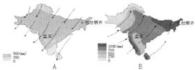 (3)印度的水旱灾害与______风变化密切相关,一般而言,B图中的风来得早,退得晚,风力强盛,容易产生______灾,反之,来得晚,退得早,风力不足,就容易产生______灾。
