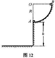 16.(8分)如图12所示,在距水平地面高为h处有一半径为R的1/4圆弧轨道,圆弧轨道位于竖直平面内,轨道光滑且末端水平,在轨道的末端静置一质量为m的小滑块A。现使另一质量为m的小滑块B从轨道的最高点由静止释放,并在轨道的最低点与滑块A发生碰撞,碰后粘合为一个小滑块C。已知重力加速度为g。求: