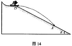 19.(9分)高台滑雪运动员经过一段滑行后从斜坡上的O点水平飞出,斜坡与水平面的夹角θ=37°,运动员连同滑雪板的总质量m=50kg,他落到了斜坡上的A点,A点与O点的距离s=12m,如图14所示。忽略斜坡的摩擦和空气阻力的影响,重力加速度g=10m/s2。