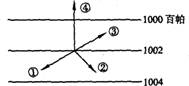 (3)请用箭头在图上画出水平气压梯度力、地转偏向力、摩擦力。(1分)