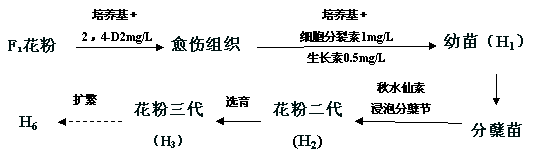 ③为了促使F1处于单核早晚期花粉细胞形成愈伤组织,基本培养基中加入2,4-D,该物质的生理作用是再分化