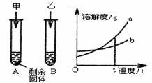 。 ①推广使用标有CNG(压缩天然气)的公交客车  ②将废旧电池深埋地下   ③控制烟花爆竹的燃放   ④垃圾分类回收    ⑤控制生活污水和工业废水的任意排放试题详情  20.(5分)t℃时,分别向盛有10g水的两只试管中,加入等质量的甲、乙两种固体物质,使其充分溶解(均不与水反应),可观察到下图所示的现象。