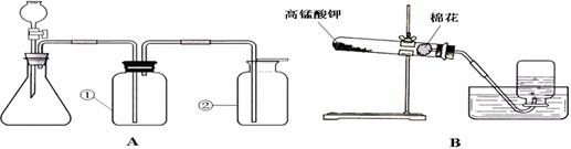 (1) 装置B表示正在用高锰酸钾制取氧气,其中还缺少的仪器是________(填名称),该反应的化学方程式为__________________________,实验完毕,为防止水倒吸,应_______________________。 (2)若想制取CO2,应选择图中的_______(填“A”或“B”)装置;若想用装置A来制取干燥的氧气,需在瓶________(填“①”或“②”)中加浓硫酸。 (3)通过上述两种制取氧气的方法所选用发生装置的对比,你觉得选择气体发生装置应考虑的因素是