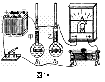 35.图18是研究电流产生热量的多少与什么因素有关的 实验装置。两个完全相同的烧瓶中装满质量相等的煤油,将电阻丝R1、R2分别放在甲、乙两瓶中,且R1>R2。接通电路,经过相同的一段时间后,发现甲瓶玻璃管中煤油上升得比乙瓶高。请根据这个现象进行说明:在什么条件下,电流产生热量的多少跟哪些因素有什么关系。