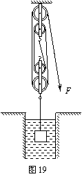 40.如图19所示,金属块的质量为60kg,某人用滑轮组将金属块从水中匀速提起,金属块在水面下10s内上升了5m,此时某人作用在绳自由端的拉力F是120N,金属的密度为3×103kg/m3不计绳重和滑轮组机械内部的摩擦及金属块在水中受到的阻力. (5分) (g取10N/kg).求: