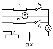 41.某校的同学们在研究电路消耗的电功率与电阻的关系时设计了如图20所示的电路,滑动变阻器的最大阻值为R3。当滑动变阻器的滑片P置于最左端时,只闭合开关S1,滑动变阻器的功率为P3,电压表的示数为U1;当滑动变阻器的滑片P置于最左端时,只闭合开关S2时,滑动变阻器的功率为P3′,电压表的示数为U2,此时电路的总电功率为4 W。已知 , ,电路中电源两端电压保持不变。(5分) (1)请你计算出电阻R1与电阻R2的比值。 (2)请你回答:如何通过开关的断开与闭合以及滑动变阻器滑片位置的改变,使整个电路消耗的总电功率最大;并请你计算出这个总电功率。