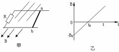 角斜向下的匀强磁场中,匀强磁场的磁感应强度B随时间的变化规律如图乙所示(规定斜向下为正方向),导体棒ab垂直导轨放置,除电阻R的阻值外,其余电阻不计,导体棒ab在水平外力作用下始终处于静止状态。规定a→b的方向为电流的正方向,水平向右的方向为外力的正方向,则在0~t时间内,能正确反映流过导体棒ab的电流i和导体棒ab所受水平外力F随时间t变化的图象是( )