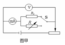 10.(10分)根据伏安法,由10V电源、0~15V电压表、0~10mA电流表等器材,连接成测量较大阻值电阻的电路。由于电表内阻的影响会造成测量误差,为了避免此误差,现在原有器材之外再提供一只高精度的电阻箱和单刀双掷开关,某同学设计出了按图甲电路来测量该未知电阻的实验方案。