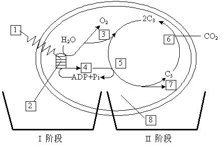 (3)光合作用的过程分为两个阶段,其中Ⅰ阶段叫做 , 在叶绿体的 进行,Ⅱ阶段叫做 ,在叶绿体的 进行。通过Ⅰ阶段,能量由 能转化为 能,通过Ⅱ阶段,则又把Ⅰ阶段转化来的能量转化为 能。