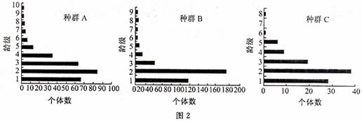 4.图2为某生态系统中黄杉的三个种群龄绒(以胸径的大小表示)的取样调查图.其中种群A为自然状态.种群B、C受不同强度的人为干扰。据图得出的结论正确的是( )