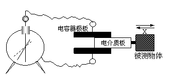 10-2 . 如图所示,是一电容式位移传感器的示意图。电容充电后与电势差计相连,如果电势差计指针变到虚线的位置处,则下列有关说法正确的是: