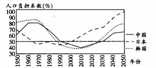 下图是中国、日本和韩国人口负担系数百年比较图,当人口负担系数≤50%称为“人口机会窗口”期。(注:人口负担系数:[(14岁及以下人口数+65岁及以上人口数)/(15-64岁人口数)]x100%),读图回答10~11题。![]()
