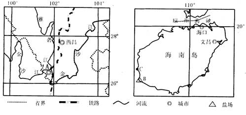 37.(1)①纬度低,自转线速度大,可提高火箭运载能力;②海运便利,利于运输大型火箭;③安全性高,三面临海,利于火箭残骸安全坠落。(2)自然资源(铁矿资源丰富)成昆钢铁 ①原料丰富(靠近铁矿区);②能源丰富(附近有煤矿、水电站);③水源充沛(地处两江汇合处);④水陆交通便利;⑤国家政策的支持。(3)莺歌海盐场①位于东南季风的背风坡,降水较少;②纬度较低,光照强,蒸发旺盛;③地形平坦开阔;④附近海水盐度较高。(4)水分①冬季,雨季已结束,降水稀少;②纬度低,光照强,蒸发旺盛;③该地常年都是农作物的生长期,需水量巨大。