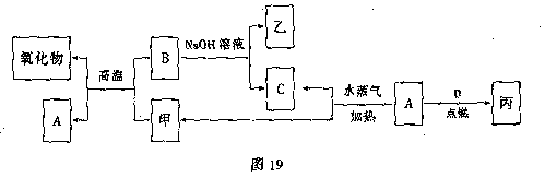 18、A、B、C、D是四种常见的单质,A、B为金属;C、D常温下是气体,且D为黄绿色气体。甲、乙、丙为常见的化合物,甲物质具有磁性。它们之间有如图19所示的转化关系: