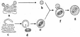(1)b是刚形成的溶酶体,它起源于细胞器a;e是由膜包裹着衰老细胞器d的小泡,而e的膜来源于细胞器c。由图示可判断:a是 ,c是 ,d是 。