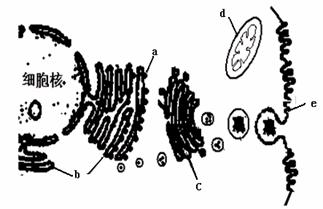 (2)用同位素示踪技术研究人体细胞内抗体合成与转运的途径,结果如图所示,图中a、b、c、d、e代表细胞结构,请据图回答。该细胞是由 细胞增殖分化而来的。此类物质从开始合成到分泌出细胞,经过的细胞器顺序是(填字母) 。
