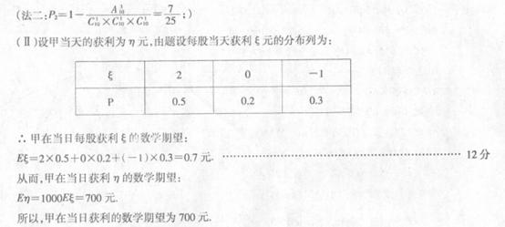 (Ⅱ)由于国家采取了积极的救市措施,股市渐趋回暖,若甲今天按上交易日的收盘价20远/股买入1000股,且雨季今天收盘时,该股涨停(比上一交易日的收盘价上涨10%)的概率为0.5,持平的概率为0.2,否则将下跌5%,求甲今天获利的数学期望(不考虑交易税)。