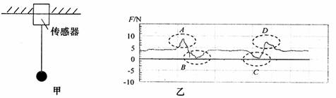 16.下图甲是某同学利用力传感器研究橡皮绳中拉力变化的装置。现让小球在竖直方向上运动,数据采集器记录下的力传感器中拉力的大小变化情况如图乙所示。由图可知A、B、C、D四段图线中小球处于超重状态的是 ( )