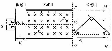 25.(18分)如图所示,粒子源S可以不断地产生质量为m、电荷量为+q的粒子。粒子从O1孔飘进(不计初速度)一水平方向的加速度电场区域I,再经小孔O2进入正交的匀强电场和匀强磁场区域II,电场强度大小为E,磁感应强度大小B1,方向如图。两平行虚线PQ、MN之间存在着水平向右的匀强磁场区域III,磁场应强度大小为B2。当在O1、O2间加上适当的电压U1时,粒子能沿图中虚线O2O3垂直于PQ进入区域III,并从MN边飞出。现将一块不带电的、宽度和厚度均不计的直角状硬质塑料板abc放置在区域III内,a、c两点恰分别位于PQ、MN上,ac连线与O2O3平行,ab=bc=L,α=45°,仍使粒子沿图中虚线O2O3进入区域III,发现粒子仍能从MN边飞出。粒子的重力不计。
