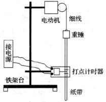 实验器材:玩具电动机,带有两个固定铁夹的铁架台,电磁打点计时器,低压交流电源,重锤,细线,米尺,纸带,复写纸片,天平等。