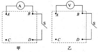 (1)试把以上器材分别画在上图甲、乙中标有A、B、C、D字样的接线柱上,使它们各自组成一个完整的电路(所用电表均为理想电表,量程也总能满足要求),并能满足以下要求:当开关S断开时,电表指针偏转到某一位置;当开关S闭合时,电表的示数为S断开时的3倍。